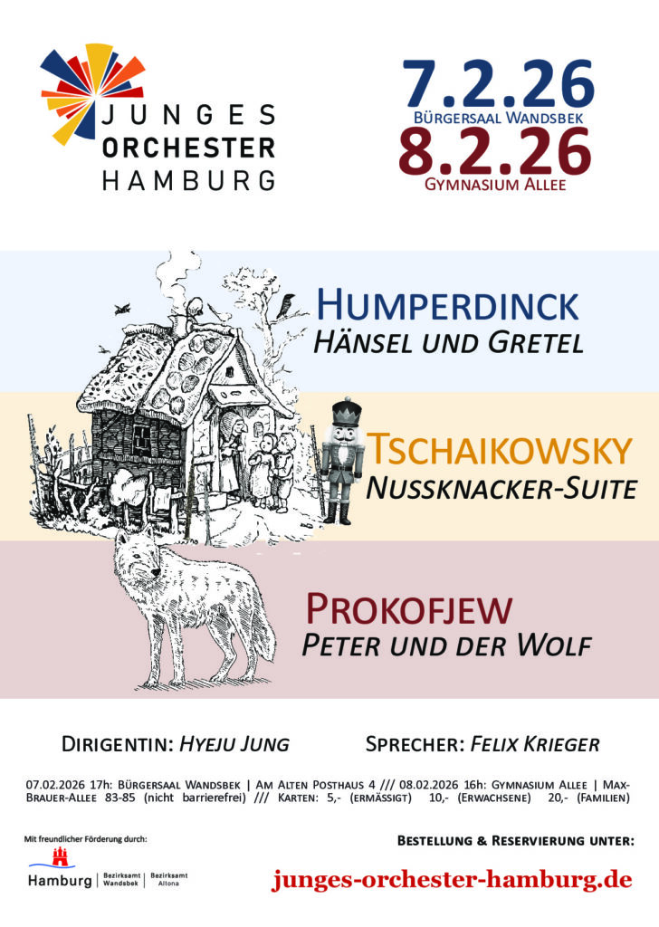 Die Konzerte sind diesmal als Familienkonzerte angelegt, Kinder sind ausdrücklich erwünscht! Das Programm ist dabei auch familienfreundlich angelegt: In der ersten Hälfte erklingt die bekannte, eingängige Nussknacker-Suite von Pyotr Tschaikowsky sowie Auszüge aus Engelbert Humperndincks Hänsel und Gretel (u.A. der berühmte Abendsegen). In der zweiten Hälfte gibt es mit Sergei Prokofjews Peter und der Wolf sogar ein live gespieltes musikalisches Hörbuch: Die Orchestermusik vertont dabei die parallel erzählte Geschichte von Peter, dem gefährlichen Wolf und zahlreichen anderen Tieren, die Peter versucht, vor dem Wolf zu retten.